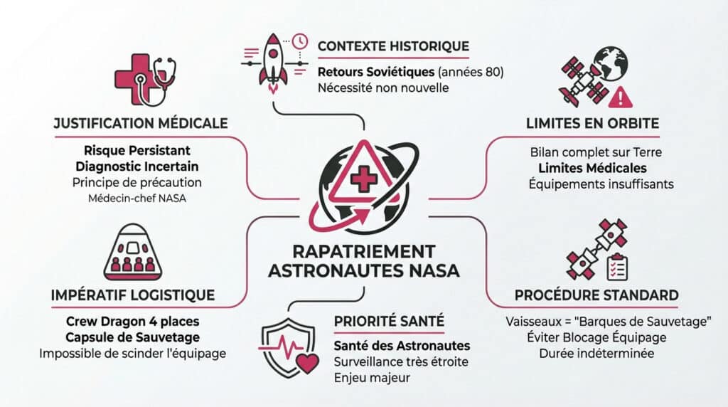 Je vous le dis franchement, on ne joue pas avec la sécurité là-haut. Le médecin-chef de la NASA, James Polk, a justifié ce retour anticipé par un « risque persistant » et une réelle « incertitude quant au diagnostic ». C’est le principe de précaution absolu qui prime ici.